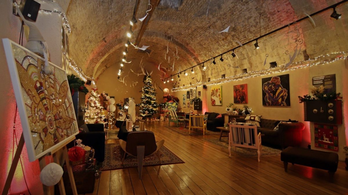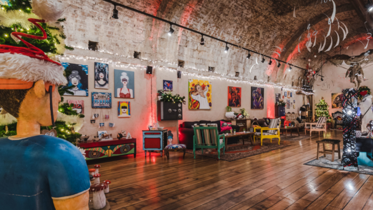 The gallery has been decorated in the style of a warm Christmas living room, featuring exactly 167 unique exhibits – paintings, photographs, installations, lamps, furniture, jewelry, and various handmade functional and decorative items. The space is adorned with thousands of lights, a Christmas tree, a fireplace, and even a flying Santa Claus.